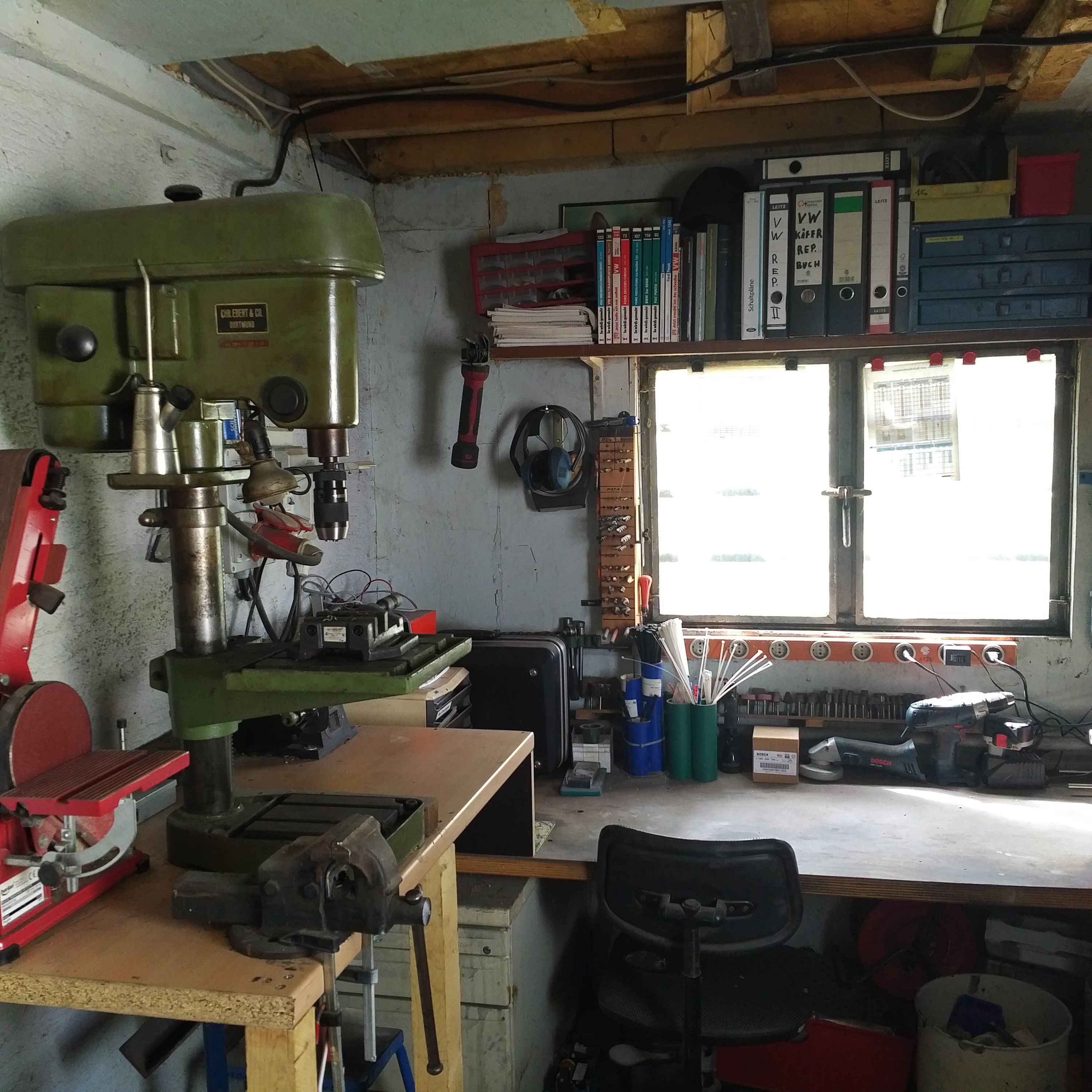 Die linke Werkstatt Seite mit der grünen alten Standbohrmaschine. Echt ein super Teil das nie aufgibt. Die rote Schleifmaschine wurde aber schon durch eine neue bessere ersetzt.